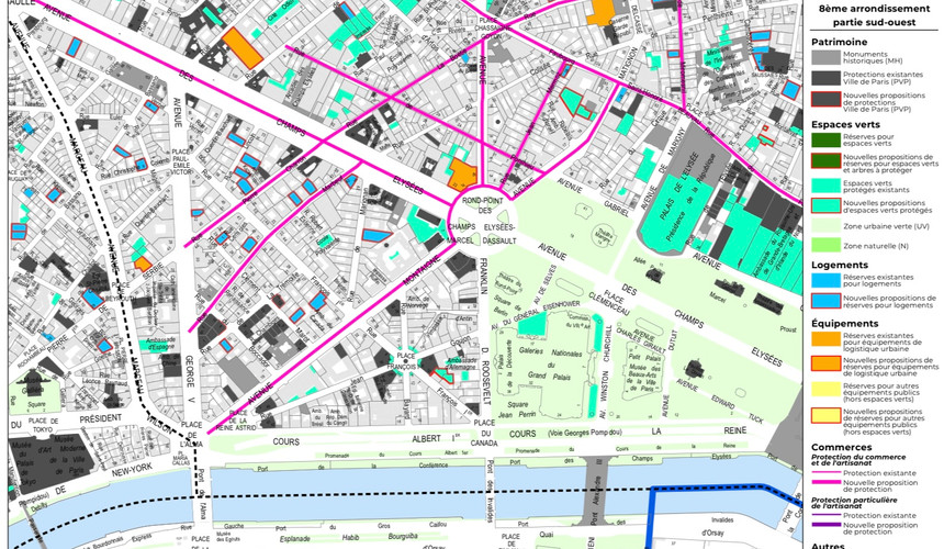 En l'état des informations dont je dispose au terme du long processus de révision du Plan Local d'Urbanisme (PLU) de Paris, près d'une centaine de parcelles de terrain du 8e arrondissement pourraient faire l'objet d'une prescription d'urbanisme en étant réservées pour la création de logement social dans le futur "PLU bioclimatique". L'arrêt de ce dernier est désormais prévu au cours du Conseil de Paris de juin 2023. Dans la terminologie de l'Hôtel de Ville, le fléchage des parcelles est qualifié de "pastillage". Soit dit en passant, c'est dans ce même "PLU bioclimatique" qu'Anne HIDALGO et sa majorité devraient rendre obligatoire de réserver de 30 à 50% de logements sociaux dans toute nouvelle construction de plus de 500 m²...
